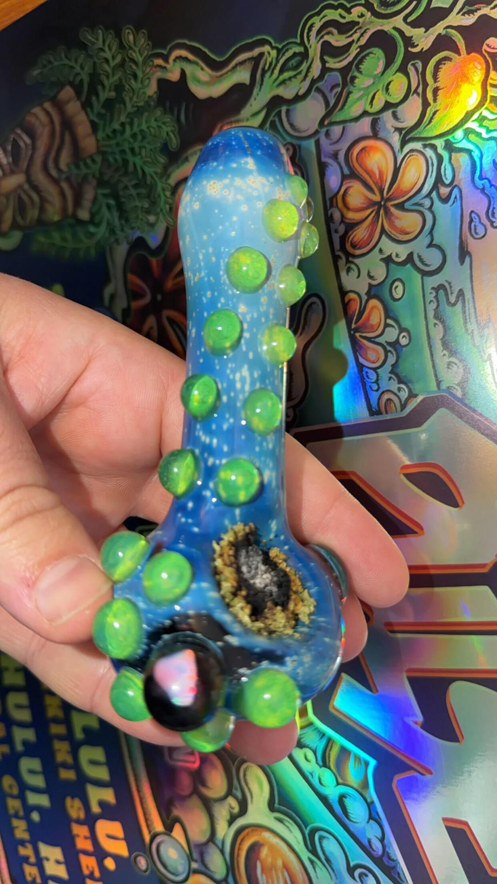 Absolutely beautiful piece. It’s like looking at the night sky. The glass is solid and heavy and the bowl pack is huge. It looks like it will be easy to clean and I’m going to enjoy it for years to come. Incredibly talented glass work.